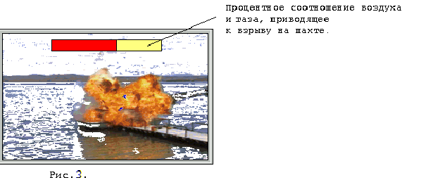 Например, можно продемонстрировать кадры взрывов на мукомольной фабрике или в шахте. Для этого можно воспользоваться картинками из библиотеки данных пакета MV или создать свою, просканировав их при помощи модуля PhotoMaster со слайдов, фотографий. Из полученных картинок в модуле Animator непосредственно создается мультфильм. Использование информационных технологий (пакет MV) дает возможность не только визуально показать такой взрыв, но и продемонстрировать процентное соотношение воздуха и пыли (или газа) на единицу объема, приводящее к взрыву (рис.3.), т.е. показать при каких условиях вероятность взрыва максимальна.