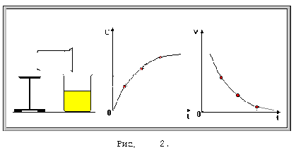 Рассмотрим фрагмент программы по “Кинетике химических реакций” на примере какой-нибудь реакции, в результате которой из бесцветных исходных веществ, после их сливания, образуется окрашенный продукт. При этом о скорости реакции можно судить не только качественно по изменению окраски раствора, но и количественно с помощью одновременного построения на экране монитора графиков зависимости концентрации (С) продукта реакции и скорости (v) реакции от времени (t)