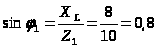 Находим величину угла φ = arccos 0,6 = 53°. Так как во второй ветви включено только емкостное сопротивление Х>С>, то: cos φ>2> = 0; sin φ>2> = -1; φ>2> = -90°.