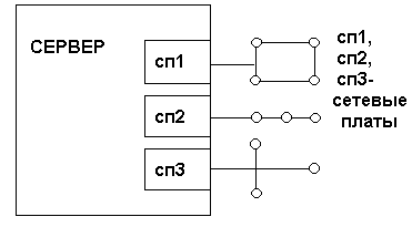 При объединении ЛВС, расположенных недалеко друг от друга, используют мосты. Мосты позволяют объединить ЛВС, отличающиеся между собой как по архитектуре, так и по методу доступа в канал. Однако все ЛВС должны быть однородны по характеру ПЭВМ, входящих в их состав. Мосты бывают внутренние и внешние. Внутренние мосты объединяют несколько ЛВС с помощью сетевых плат в файловом сервере (рис.5.8 ), которых может быть не более 4-х.