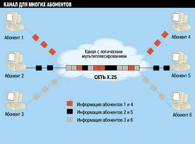 Метод разделения физического канала между абонентами в сетях X.25 называют еще мультиплексированием канала, точнее, "логическим" или "статистическим" мультиплексированием (Рис. 4). Термин "логическое мультиплексирование" вводится, чтобы отличить этот метод, например, от временного разделения канала. При временном разделении канала каждому из разделяющих его абонентов выделяется в каждую секунду строго определенное количество миллисекунд для передачи информации.