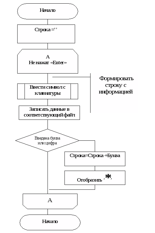Как видно алгоритм ввода строки с информацией и ввод пароля отличается только то, что вместо введенного символа отображается «*». Эти алгоритмы можно реализовать одной подпрограммой, введя признак вводимой строки (пароль /данные).