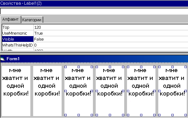 Рассматриваем ту же задачу, те же коробки, с использованием тех же массивов элементов ( ... но "как-то по-другому ..." ). Всё таже форма, всё тот же Label1(0), всё таже клавиатура ... На метке выполняем комбинацию клавиш Ctrl + C, затем Ctrl + V (отвечая положительно на появившийся вопрос диалогового окна среды разработки). Разместите появившуюся метку правее от имевшейся метки. Повторите ещё: Ctrl + V и разместите правее второй. Продолжайте повторение до тех пор пока не разместите метку Label1(9) правее метки Label1(8). Теперь выделите имеющиеся метки с индексами больше единицы. И измените свойства этих меток на противоположное - False. Label1(1) и Label1(0) поменяйте местами.
