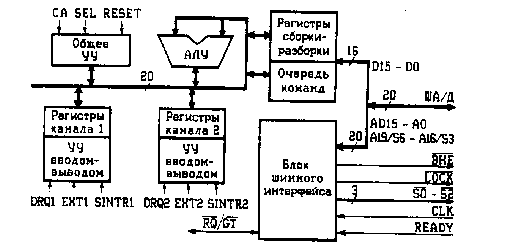 Структура процессора ввода — вывода (рис 4) включает несколько функциональных узлов, соединённых 20-битовой внутренней шиной для получения максимальной скорости внутренних пересылок. (В отличие от 16-битовой внешней шины по внутренней шине осуществляются пересылки как 16-, так и 20- битовых значений адресов и данных.)