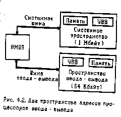 Процессор может обращаться к памяти и устройствам ввода — вывода (УВВ), размещенным в системном пространстве адресов емкостью 1 Мбайт или в пространство ввода – вывода ёмкостью 64 Кбайт (рис 4.2). Хотя СПВВ располагает только одной физической шиной данных, удобно полагать, что в системное пространство он обращается по системной шине (СШ) данных,