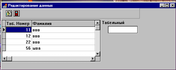 Нажимая на кнопки вы сможете просмотреть записи, при чем поля : Табельный номер, Имя и Фамилия будут отображаться в строках над таблицей. После работы с программой щелкните по кнопке Выход. Окно просмотра базы исчезнет и останется окно печати данных. Теперь можете вводить правильный табельный номер.