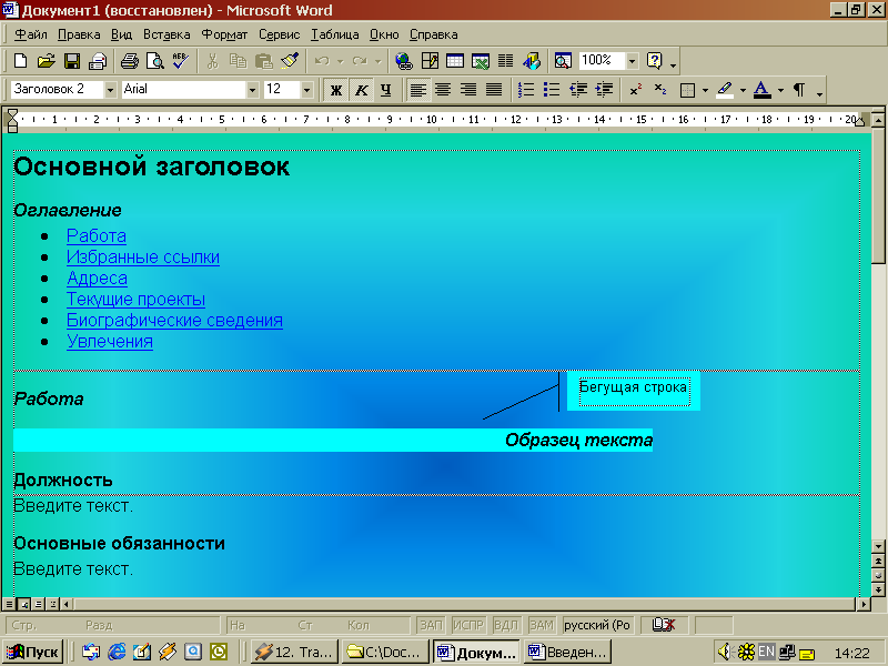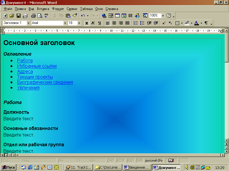 Там предложено несколько вариантов разметки страницы (личная основная страница, оглавление, обзор, регистрационная форма и т. п.), и стилей цветового оформления, из которых всегда можно выбрать подходящий. Эти шаблоны могут многому научить пользователя. Microsoft Word позволяет открывать готовые HTML-документы. Так же когда сохраняют документы Интернет c помощью средства просмотра ресурсов (Microsoft Internet Explorer), надо выбирать формат HTML. Это поможет сохранить форматирование и использовать его в своей дальнейшей работе. Лучший инструмент редактирования этих документов на рабочем месте - Microsoft Word 97.