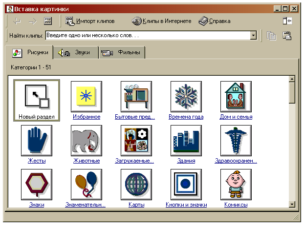 Выделить рисунок, который необходимо вставить, и нажать кнопку Вставка или просто щелкнуть левой кнопкой мыши по понравившемуся рисунку.