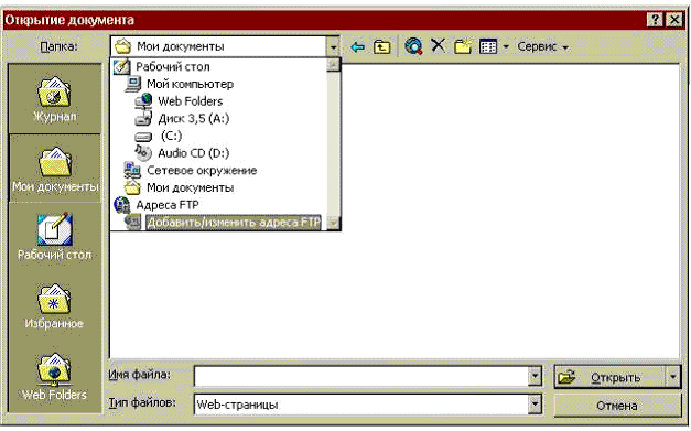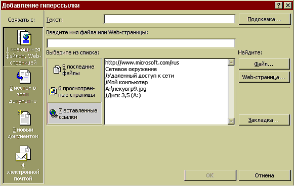 3. Выбрать команду Вставка, Гиперссылка. Появится диалоговое окно Добавить гиперссылку.