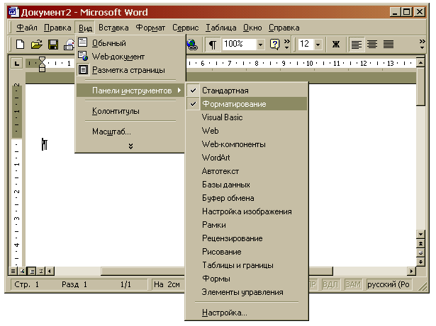 На рис.1 показаны зона заголовок, горизонтальное меню, четыре панели инструментов, полосы прокрутки, линейки и строка состояния.