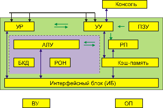 Блок УР предназначенный для хранения управляющей информацией и содер-жащей регистры и счётчики, участвующие совместно с УУ в управлении вы-числительным процессом: регистр состояния ЦП, счётчики команд и тактов, регистр запросов прерывания и др. УР также включает управляющие триггеры, фиксирующие режимы работы ЦП.