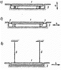 Рис. Схемы виброизоляции виброактивного оборудования: а – опорный вариант; б – подвесной вариант; в – виброизоляция от вертикальных и горизонтальных колебаний.