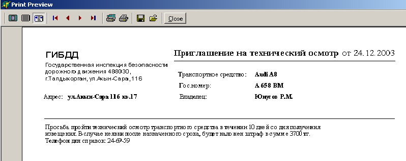 Во втором подпункте меню «Работа», ведется работа с владельцами транспортных средств, просрочивших дату тех.осмотра. Имеется возможность поиска владельца по фамилии, а также возможность печати приглашения на технический осмотр транспортного средства. Вид окна печати данного приглашения приведен на рис. 4.