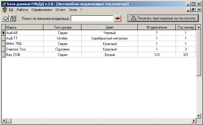 Пункт меню «Работа» содержит в себе следующие подпункты: «Поиск автомобиля» (рис.2) и «Приглашение на тех.осмотр» (рис.3). В первом подпункте ведется поиск, имеется возможность поиска транспортного средства по различным критериям.