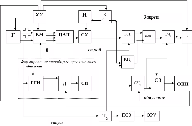 Рассмотрим формирование и перемещение стробирующего импульса. Передний фронт импульса генератора Г, совпадающий с началом переходного процесса, осуществляет запуск генератора пилообразного напряжения ГПН, возрастающий сигнал которого (рисунок 6б) поступает на один из входов дискриминатора уровней Д. В момент превышения пилообразным сигналом значения, поступающего на дискриминатор Д с формирователя порогового напряжения ФПН, дискриминатор срабатывает и с помощью ГСИ формирует стробирующий импульс.