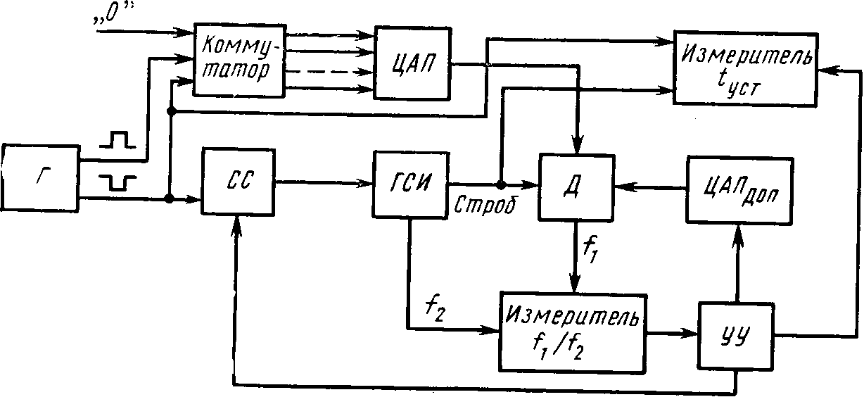 Формируемый ток смещения соответствует установившемуся значению выходного сигнала контролируемого ЦАП. Каждую анализируемую точку переходного процесса стробируют п раз с частотой f >2 >генератора Г. По мере приближения выходного тока контролируемого ЦАП к току смещения дополнительного ЦАП частота срабатывания f>1> дискриминатора Д на туннельном диоде возрастает. Отношение частот f>1>/f>2> анализируют устройством управления УУ. Если оно находится в допустимых пределах заданного значения, то стробирующий .импульс перемещают к началу переходного процесса и анализ следующих точек переходного процесса повторяют до момента, когда отношение частот f>1>/f>2> превысит заданное (последнее определяется допустимым отклонением выходного тока контролируемого ЦАП от установившегося значения, а также характером шумовой помехи на туннельном диоде и видом зависимости частоты срабатывания схемы сравнения от тока смещения). После этого перемещение стробирующего импульса прекращают и измеряют временной отрезок между фронтами импульсов генератора и стробирующих импульсов ГСИ. Следует, однако, отметить, что вследствие большого уровня шумов, временной и температурной нестабильности параметров туннельного диода данная схема обеспечивает контроль ЦАП с разрядностью не более 8—9.