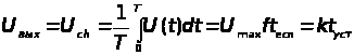 Поскольку моменты запуска и нормализации триггера Т2 определяются соответственно фронтом импульсов генератора Г, совпадающим с началом переходного процесса, и стробирующим импульсом, периодическое появление которого совпадает с моментом достижения переходным процессом установившегося значения, то длительность повторяющихся с частотой генератора выходных импульсов триггера Т>2> в конце измерительного цикла равна длительности переходного процесса исследуемого сигнала (рисунок 6е). Длительность выходных импульсов триггера Т>2> с помощью преобразователя средних значений ПСЗ преобразуется в пропорциональное напряжение постоянного тока, фиксируемое, по окончании измерительного процесса отсчетно-регистрирующим устройством ОРУ. Поскольку частота генератора фиксирована, При постоянстве амплитуды U>max> импульсов триггера Т>2> в качестве ПСЗ можно использовать преобразователь среднего значения импульсного сигнала в пропорциональное напряжение постоянного тока U>cp>. В этом случае его выходное напряжение U>вых> однозначно определяет длительность преобразуемых импульсов, а следовательно, длительность переходного процесса t>ycт>, т. е.: