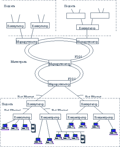 Из-за того, что транспортная система создает основу для взаимосвязанной работы отдельных компьютеров, ее часто отождествляют с самим понятием "корпоративная сеть", считая все остальные слои и компоненты сети просто надстройкой. В свою очередь, транспортная система корпоративной сети состоит из ряда подсистем и элементов. Наиболее крупными составляющими транспортной системы являются такие подсистемы как локальные и глобальные сети корпорации, опять же понимаемые как чисто транспортные средства. В свою очередь каждая локальная и глобальная сеть состоит из периферийных подсетей и магистрали, которая эти подсети связывает воедино. Например, крупная локальная сеть, приведенная на рисунке 1.2, состоит из подсетей, объединенных магистралью, включающих два кольца FDDI и четыре маршрутизатора. Каждая подсеть также может иметь иерархическую структуру, образованную своими маршуртизаторами, коммутаторами, концентраторами и сетевыми адаптерами. Все эти коммуникационные устройства связаны разветвленной кабельной системой.