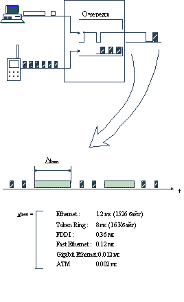 Так, для классического 10-Мегабитного Ethernet'а максимальный размер пакета равен 1526 байт (со всеми служебными полями и преамбулой). Значит, максимальное время его передачи составит 1.2 мс. Это не так много для большинства видов синхронного мультимедийного трафика. Хуже обстоят дела в сетях TokenRing, где кадры могут достигать размера в 16 Кбайт. При скорости в 16 Мб/с это может привести к задержке в 8 мс, уже оказывающей заметное влияние на качество голоса или изображения. Для сетей FDDI с битовой скоростью 100 Мб/с и максимальным размером кадра 4500 байт задержка составит всего 0.36 мс, для сетей Fast Ethernet - 0.12 мс, GigabitEthernet - 0.012 мс, а АТМ при скорости 155 Мб/c и размере ячейки в 53 байта - всего 2.7 мкс.