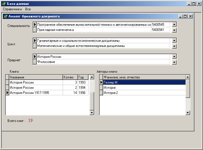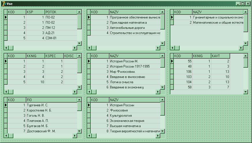 выбирает из таблицы knigi.db все поля, где значения kdisc и kspec – берутся из верних таблиц. Результаты запроса отображаются в таблице «Книги».