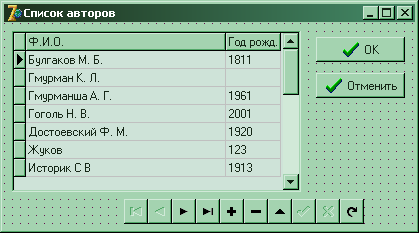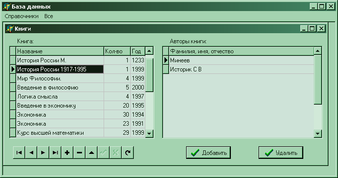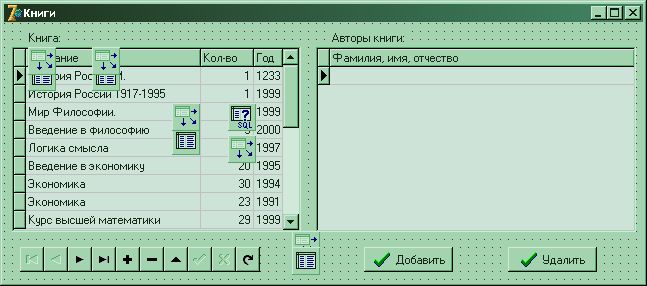 Для навигации по названиям книг можно пользоваться компонентом «DBNavigator», который привязан к тому же набору что и DBGrid1(левая таблица). Для добавления и удаления автора надо пользоваться кнопками «Добавить» и «Удалить».