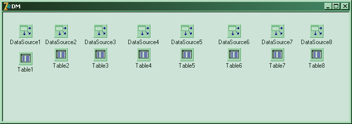 В этой форме заголовки столбцов в таблицах показываются «как есть», в отличие от всех предыдущих форм, где заголовок задавался на этапе проектирования – для удобства и наглядности. DBGrid’ы связаны с наборами данных, расположенными на поверхности формы DM, которая имеет тип DataModule.