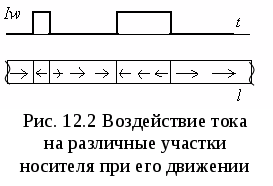 Для горизонтальной магнитной записи МГ записи имеет небольшой зазор, через который замыкается магнитный поток. Под действием тока в обмотке домены носителя ориентируются в одном направлении. Если изменить направление тока записи I>w >, то ориентация доменов будет противоположной (рис. 12.2). Количество переходов, размещаемых на единице площади носителя, называют физической плотностью записи. Этот параметр зависит от метода магнитной записи, величины зазора в МГ и ее конструкции, расстояния между МГ и покрытием носителя и др.