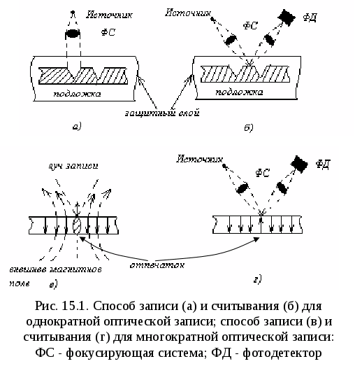 Способы записи устанавливают соответствие отпечатков на поверхности носителя значениям «0» и «1». Наиболее распространенными являются способы записи без возврата к нулю (БВН), частотной (ЧМ) и фазовой (ФМ) модуляции, группового кодирования (ГК). Трактом или каналом записи-воспроизведения называют совокупность аппаратных средств, позволяющих при операциях записи получать отпечатки и восстанавливать записанную кодовую последовательность при операциях чтения. При магнитной записи основными компонентами тракта являются головка записи и воспроизведения, усилители записи и воспроизведения, детекторы информационных и синхронизирующих сигналов, схемы управления.