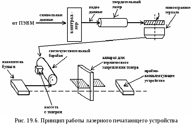 Принцип действия лазерных печатающих устройств схож с принципом действия электростатических копировальных устройств (рис. 19.6).