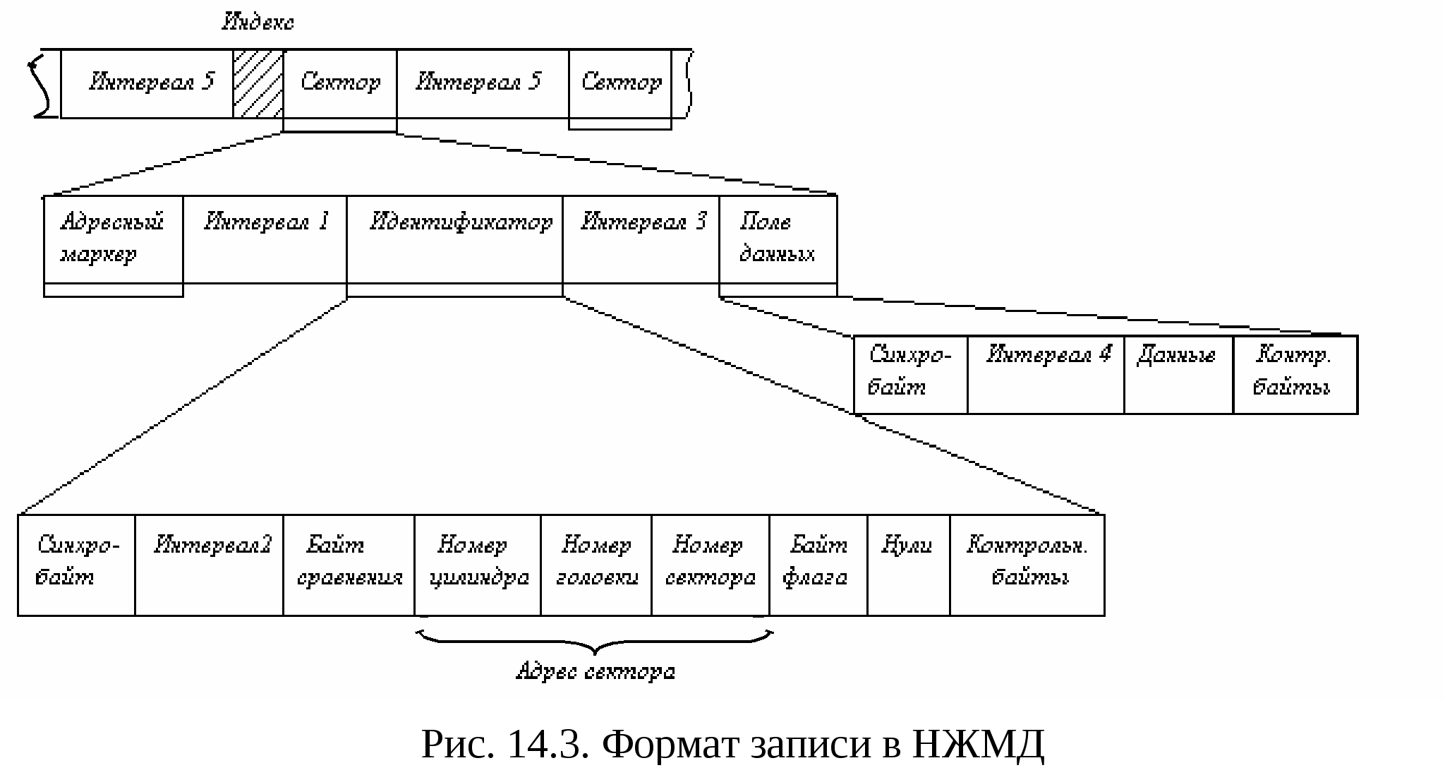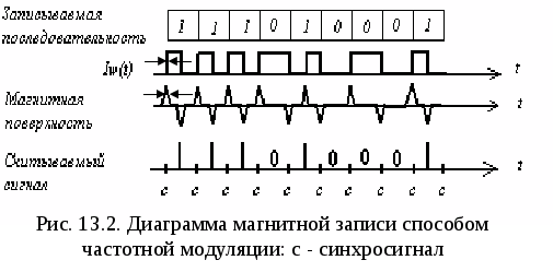В НГМД используют два основных метода записи: метод частотной модуляции (ЧМ) (рис. 13.2) и метод модифицированной ЧМ. В контроллере (адаптере) НГМД данные обрабатываются в двоичном коде и передаются в НГМД в последовательном коде.
