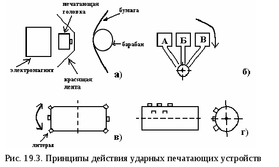 Среди ударных печатающих устройств различают матричные последовательного типа (рис. 19.3, а), с шрифтоносителем типа “ромашка” (рис. 19.3, б), со сферическим шрифтоносителем (рис. 19.3, в) и с шрифтоносителем барабанного типа (рис. 19.3, г).