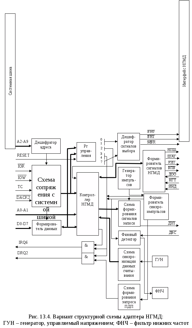 Позиционирующая система служит для установки магнитной головки точно над определенной дорожкой на поверхности диска. Все электрические схемы размещаются на печатной плате, компонуемой в корпусе НГМД. Обычно в профессиональной ПЭВМ к одному адаптеру через интерфейс можно подключать до четырех НГМД. Электронные схемы выборки поэтому имеют четыре входа. Для подключения определенных НГМД применяются микропереключатели.