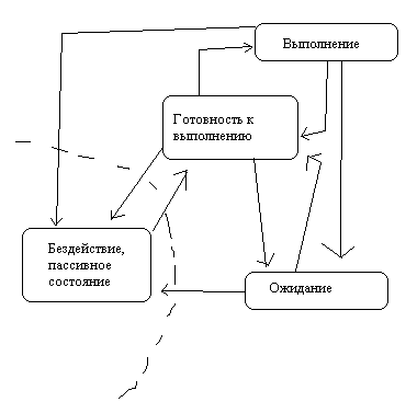 В большинстве ОС последнее состояние подразделяется на множественное состояние ожидания. соответствующее определенному виду ресурса из-за отсутствия которого процесс переходит в состояние ожидания. В обычных ОС процесс появляется при запуске какой либо программы. Ос организует (порождает или выделяет) для нового процесса соответствующий дескриптор процесса и процесс начинает развиваться (задача начинает выполняться). Поэтому в обычных ОС пассивного состояния не существует. В ОС реального времени ситуация несколько иная Обычно при проектировании ОС реального времени заранее известен состав программ или задач, которые будут выполняться. Известны при этом многие их параметры, которые необходимо учитывать при распределении ресурсов (объем требуемой памяти, время выполнения, приоритет выполнения, используемые устройства). Поэтому для ОС реального времени заранее заводят дескрипторы задач с тем, чтобы впоследствии не тратить время на организацию дескриптора и поиск для него необходимых ресурсов. Поэтому в таких ОС некоторые процессы могут находится в состоянии бездействия.