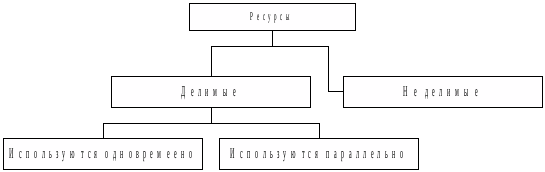 Ресурсы могут быть разделяемыми, когда несколько процессов могут использовать их одновременно (в один и тот же момент времени) или параллельно (в течение некоторого времени процессы используют ресурс попеременно) и неразделяемыми.
