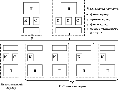 В зависимости от функций, возлагаемых на конкретный компьютер, в его операционной системе может отсутствовать либо клиентская, либо серверная части.