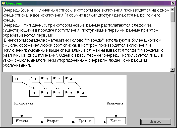 Очередь (queue) — линейный список, в котором все включения производятся на одном конце списка, а все исключения (и обычно всякий доступ) делаются на другом его конце.