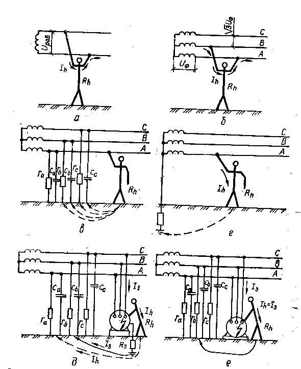 Рисунок 4.1 - Схемы прикосновения к токоведущим частям и к корпусу, оказавшемуся под напряжением: а, б — двухфазное (двухполюсное) прикосновение; в,г однофазное (однополюсное) прикосновение в сети с изолированной и заземленной нейтралью; д, е — прикосновение к «пробитому» корпусу при исправном заземлении и отсутствии заземления.