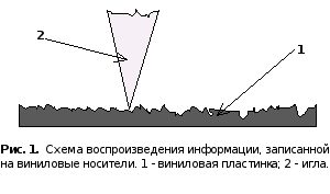 Приводился в действие механизм, вра-щающий пластинку, и ставилась игла на пластинку. Игла плавно плыла по канавкам, прорубленным в пластинке, издавая при этом различные звуки — в зависимости от глубингы канавки, её ширины, наклона и.т.д., используя явление резонанса. А после труба, находившаяся около самой иголки, усиливала звук, “высекаемый” иголкой. (рис. 1)