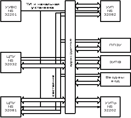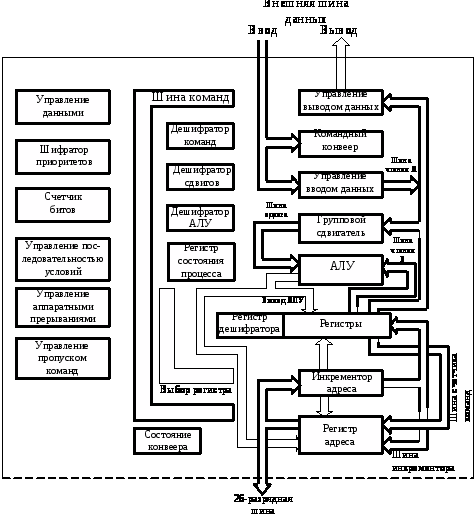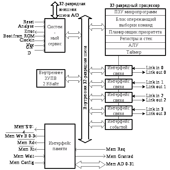 Транспьютер Т414 представляет собой 32 – разрядный микропроцессор, в состав которого входят центральное процессорное устройство с архитектурой КСНК, внутрикристальное ЗУПВ емкостью 2 Кбайт, четыре быстродействующих последовательных канала связи и таймер с разрешающей способностью 1 мкс. Внутренняя архитектура транспьютера соответствует фон-неймановским принципам, т.е. включает единую шину адресов и данных, связывающих ЦПУ со встроенной и внешней памятью.