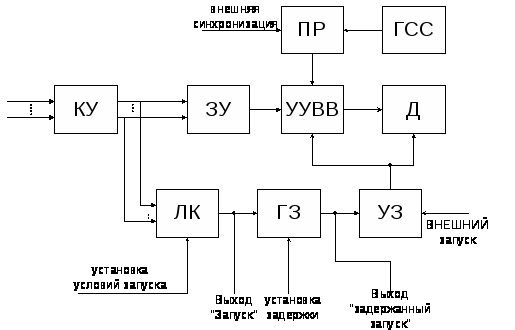 ЛА (рис.7.1) включает в себя компаратор уровней входных сигналов (КУ), запоминающее устройство (ЗУ), логический компаратор (ЛК), генераторы задержки (Г3) и синхросигналов (ГСС), переключатель режима (ПР), устройства запуска (У3) и управления визуальным выводом (УУВВ), дисплей (Д).