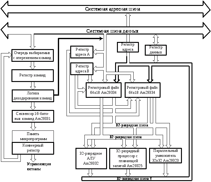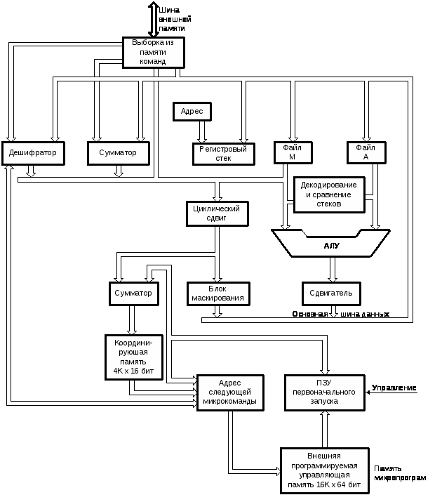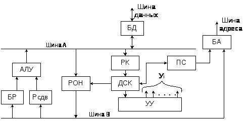 Как альтернатива этому направлению являются компьютеры с сокращенным набором команд (КСНК) или RISС-процессоры, которые превосходят производительность ЭВМ с большими наборами команд, так как благодаря организации их команд последние выполняются за один машинный цикл. Большинство операций в КСНК имеют характер «регистр-регистр», а обращения к основной памяти происходят только для выполнения простых операций загрузки в регистры и занесения в память; смежные же команды преобразуются в последовательность простых, которые выполняются быстрее. Уменьшение количества логических вентилей и объема микропрограммных ПЗУ позволяет существенно снизить размеры МП и их стоимость. На рис. 6.1 приведена структурная схема базовой архитектуры компьютера с сокращенным набором команд.