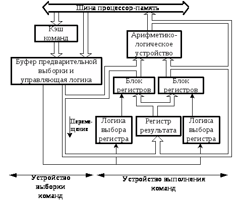 Блок выборки команд осуществляет опережающую выборку команд из основной памяти или кэша и помещает их в буфер предварительной выборки. Блок реализации команд принимает команды из буфера предварительной выборки и выполняет необходимые операции, после чего помещает результат в один из регистров, подготавливая последующее выполнение операции «регистр – регистр».
