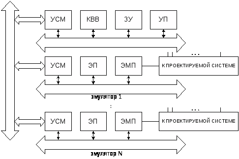 Недостатком однопроцессорных одномагистральных комплексов является то, что МП должен выполнять как функции эмулятора, так и системные функции комплекса (трансляцию программ, редактирование и т.п.). Недостатком многопроцессорного одномагистрального комплекса является то, что в данный момент времени может работать только один МП. Многопроцессорные многомагистральные комплексы (рис. 7.4) лишены этих недостатков: каждый ВСЭ имеет эмулятор микропроцессора (ЭМП), собственную память (ЭП) и магистраль, что позволяет ему вести эмуляцию одновременно и независимо от МП других эмуляторов.