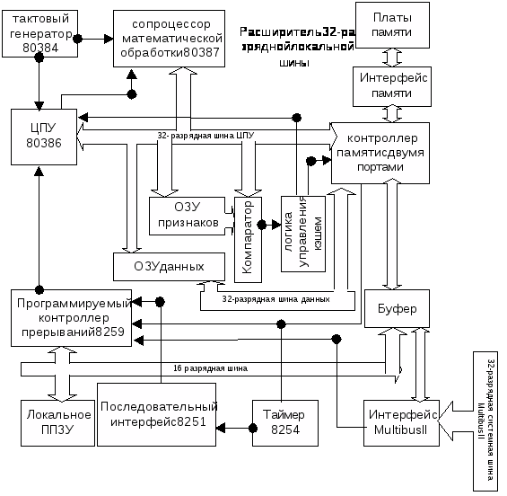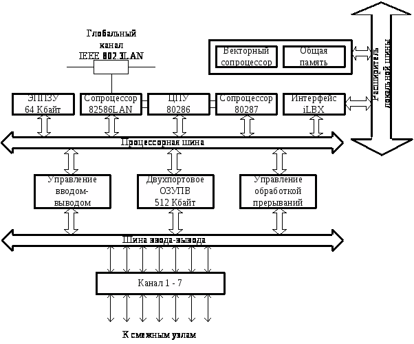 Управляющий процессор куба (микроЭВМ системы 286/310 фирмы Intel) соединяется с каждым узлом посредством локальной сети IEEE 802.3 и обеспечивает реализацию системного интерфейса, а также системы разработки программных средств на основе операционной системы типа XENIX. Наличие семи каналов связи у каждого узла определяет возможность построения гиперкуба с максимальным числом N=27=:128 узлов. Ядро операционной системы размещается в ЗУПВ и обеспечивает реализацию основных сервисных функций.
