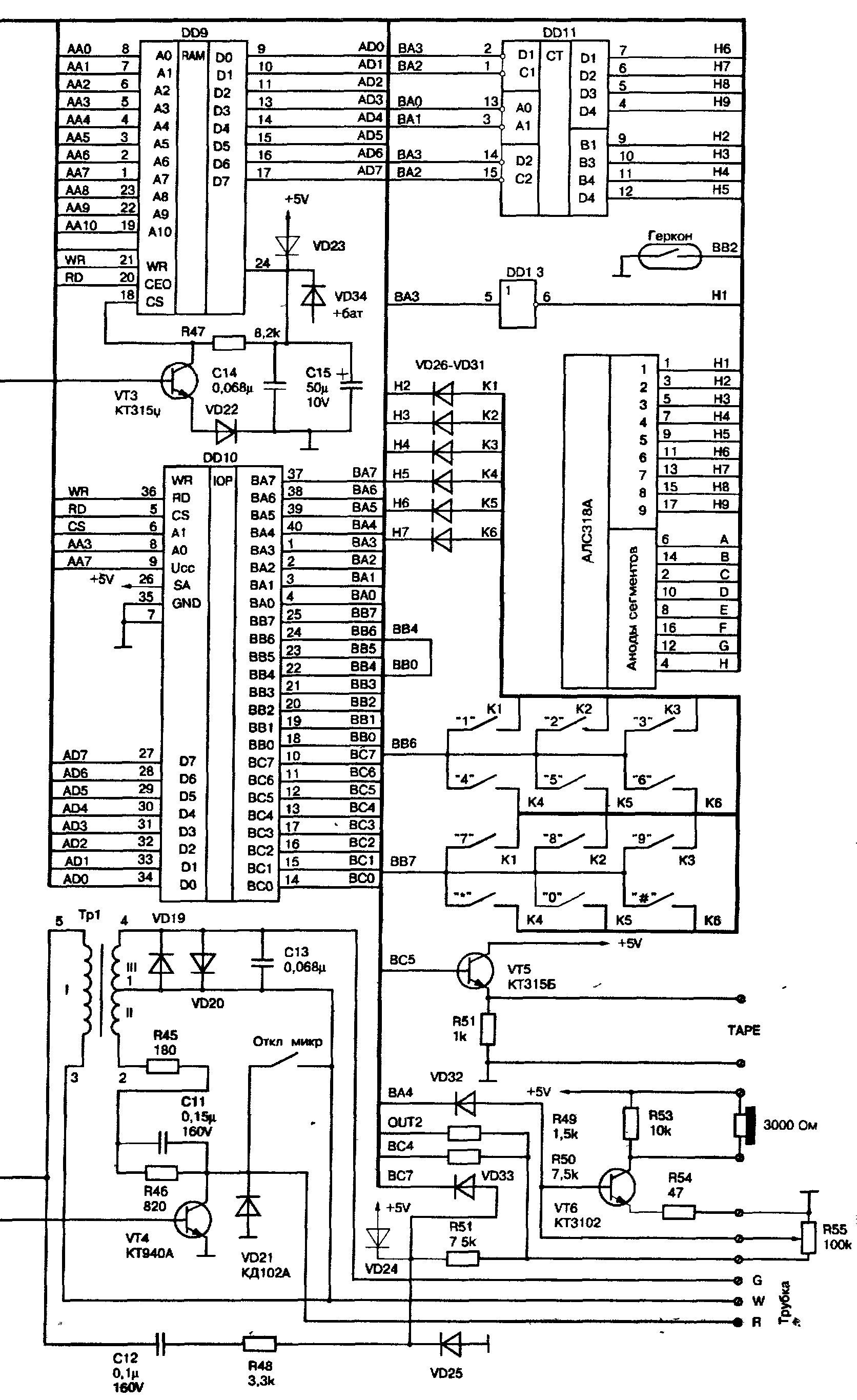 Сигналы, от этих источников проходя через ограничительные сопротивления R30-R32, складываются в один сигнал, который подается на регулятор громкости на переменном резисторе R33. Далее сигнал поступает на усилитель, выполненный на транзисторе VT6. Здесь необходимо отметить роль диода VD28. Он реализует функцию программной блокировки звука. При подаче на выход порта ВА4 уровня лог. 1 ток базы транзистора VT6 шунтируется черезVD28, при этом сигнал на усилитель не подается и звук не формируется.