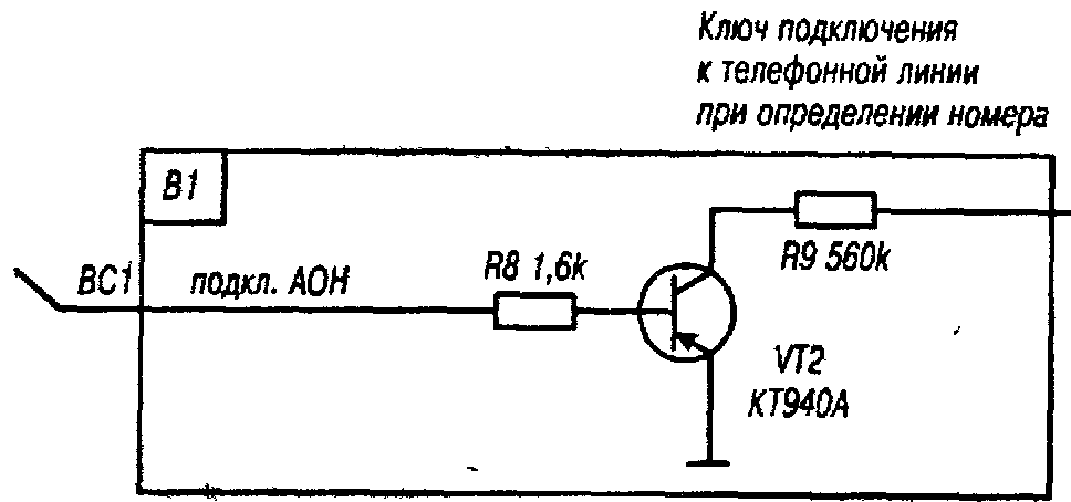 Узел реализован на элементах: R8,R9,VT2, где R8 - ограничитель тока базы VT2 (1-1,6КОм), VT2 - ключевой элемент (осуществляет подключение к телефонной линии нагрузки R9), обеспечивающий необходимый для реализации алгоритма определения номера потенциал линии VT2 - транзистор КТ940А или любой с U>кэ>-150V;