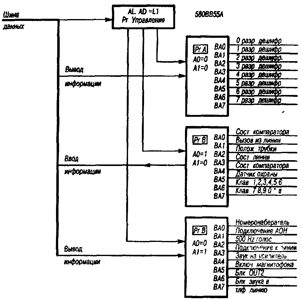 Содержит 24 триггера, которые доступны для анализа ЦП. Причем 8 из 24 ориентированы им на прием информации из различных узлов телефона, а остальные 16 триггеров настроены ЦП на вывод информации, управляя аналоговой частью телефона.