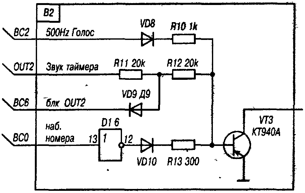 Назначение и работа элементов: При автоматическом определении номера (без поднятия трубки), АОН подключаясь к телефонной линии, имитирует сигнал «контроль посылки вызова», который призван замаскировать работу АОНа. Частоту, соответствующую этому сигналу, вырабатывает таймер на выходе OUT2, и через резисторы R11, R12 он поступает на коммутирующий элемент VT3. Так как сигнал должен быть прерывистым - 1 с звучит, 4 с отсутствует, а таймер генерирует частоту постоянно, то сигналом с триггера BC6=0 (D6) через VD9 периодически осуществляется блокировка сигнала таймера.