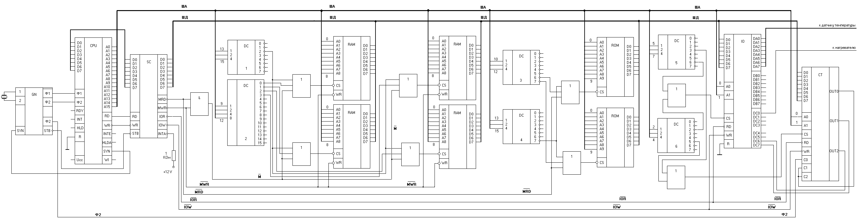 Микросхемы ОЗУ и ПЗУ подключены к шине адреса ЦПУ согласно карте памяти, при этом двоичные адреса каждой из