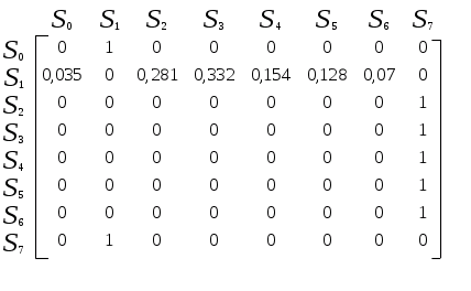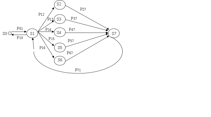 Определяется матрица вероятностей передач Р=|Pij|, где Pij – вероятность того, что заявка, поступающая в систему Si, поступит в систему Sj (i,j=0,…, n), где n- число каналов в системе. Очевидно, что Pii = 0 и сумма Pij =0 для любого i.